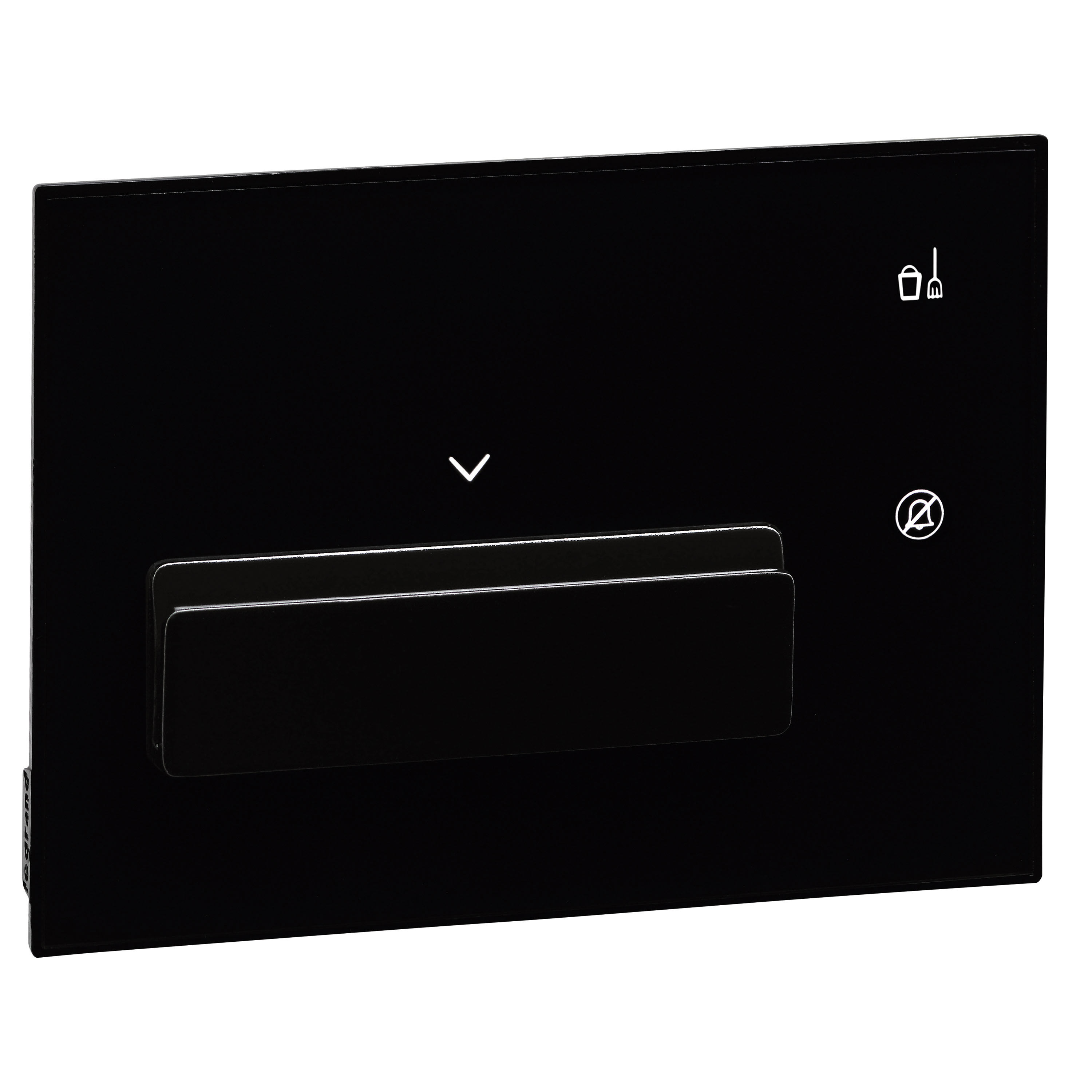 Tasca porta-badge touch BASE, con finitura placca colore NERO con lettore RFID in materiale plastico della serie PREMIUMPermette l’attivazione delle funzioni nella camera di albergo con riconoscimento in tecnologia RFID e di comandare le segnalazioni fuori porta di NON DISTURBARE (DND) e “RIORDINARE LA CAMERA” (MUR).Fessura per badge con illuminazione incorporata.Collegamento a SCS-BUS, dimensioni 3 moduli.