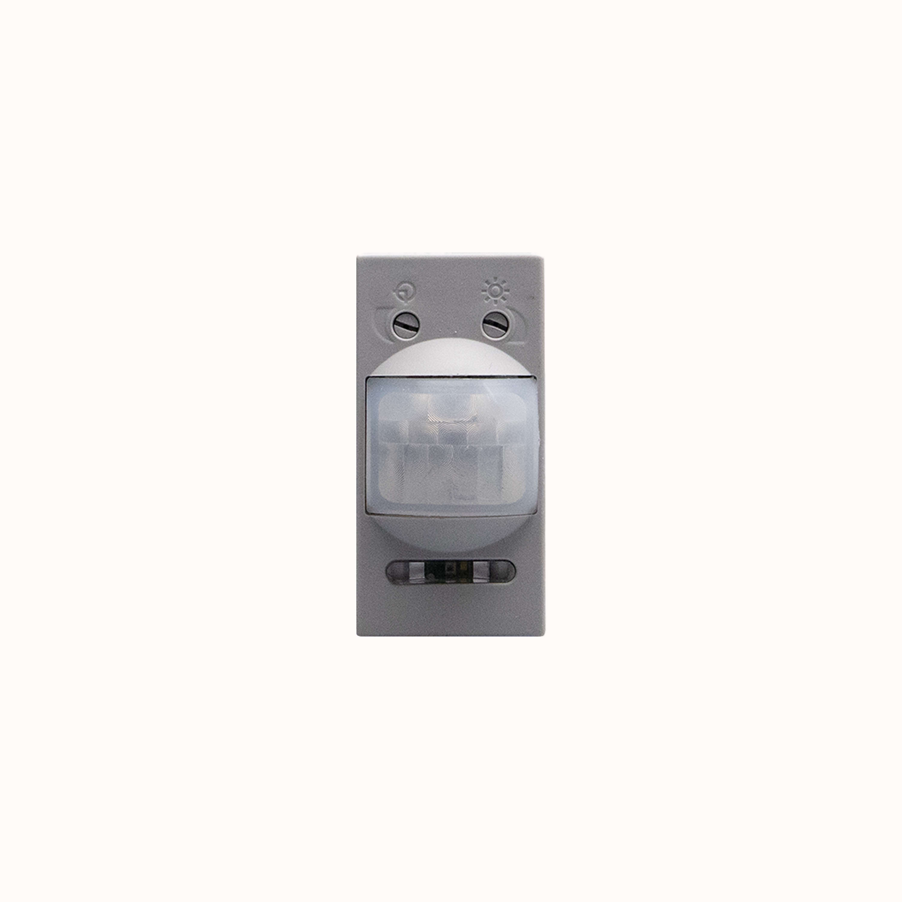 Interruttore con sensore di movimento a raggi infrarossi passivi adatto per tutti i tipi di carico comprese lampade LED - 3 fili - circuito crepuscolare a soglia variabile con possibilità di esclusione - circuito di temporizzazione per ritardo spegnimento regolabile da 30 secondi a 10 minuti - alimentazione 230 Va.c. - 1 modulo - grigio