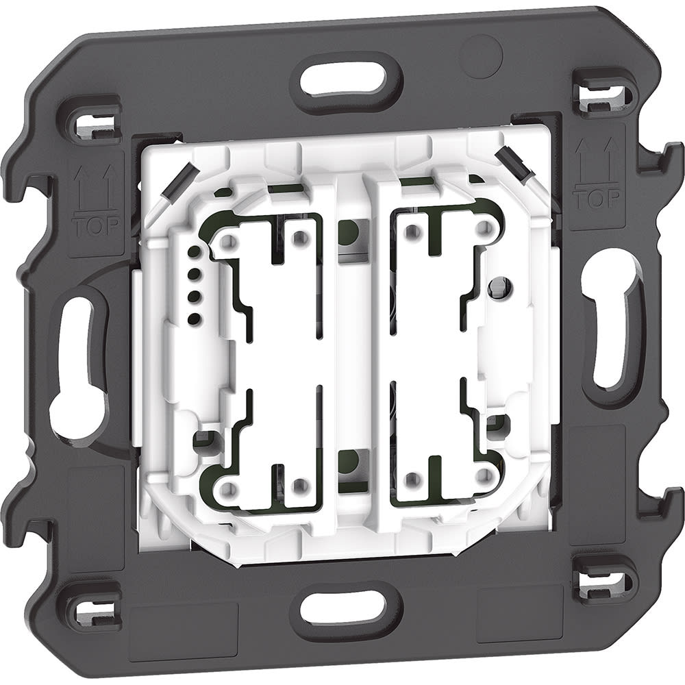Comando doppio luci wireless dotato di due pulsanti per il controllo di due diversi dispositivi connessi per il comando di luci. Ogni singolo pulsante può essere associato ad uno o più dispositivi. Installazione superficiale con adesivi riposizionabili (forniti a corredo) o su scatole da incasso. LED integrato per la segnalazione batteria scarica. Alimentazione a batteria 3 V tipo CR2032 (fornita a corredo) con autonomia di 8 anni - 2 moduli.
