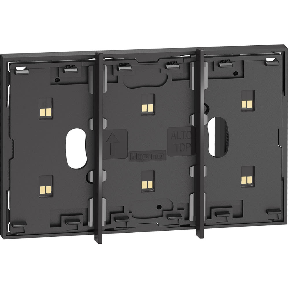 Frame elettrificato con barrette estetiche (rimovibili) di divisione tra i comandi. Per l’installazione di max. 3 comandi digitali o cover art. KW/KG/KM8100 in scatola da 2 moduli con apposito supporto art. K8102. Colore nero.