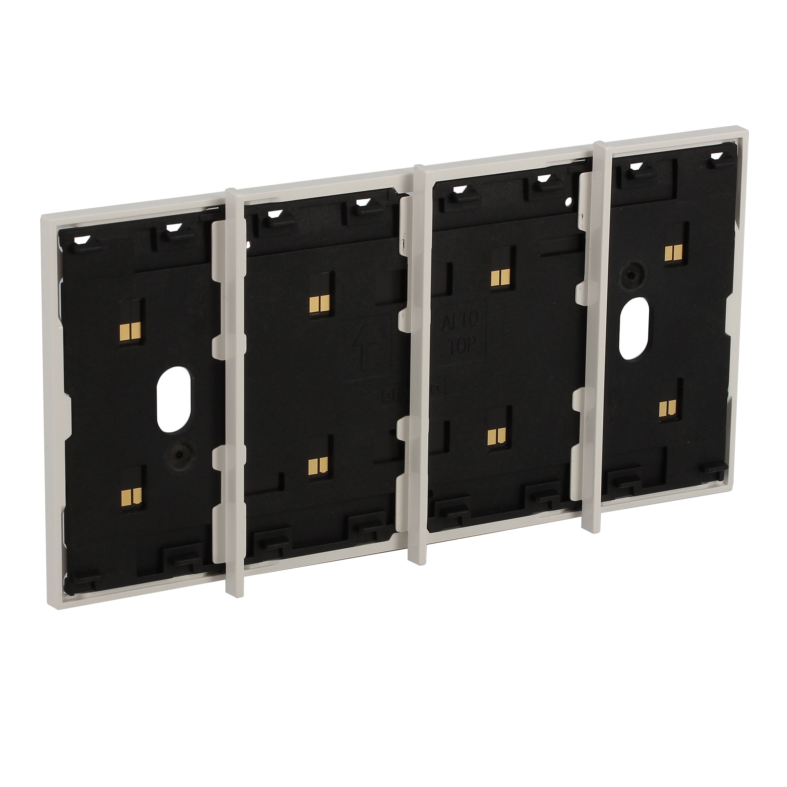 Frame elettrificato con barrette estetiche (rimovibili) di divisione tra i comandi. Per l’installazione di max. 4 comandi digitali o cover art. KW/KG/KM8100. Installazione in scatola da 4 moduli con supporto K4704. Colore bianco.
