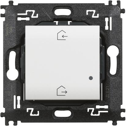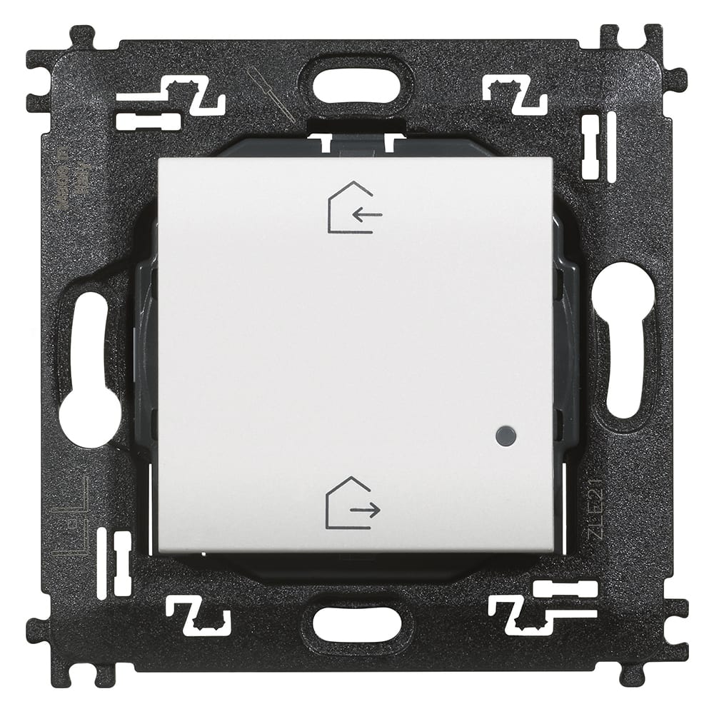 Comando scenario Entra&Esci wireless. Dispositivo dotato di 2 pulsanti per l’attivazione degli scenari Entra ed Esci personalizzabili dall’app HOME + CONTROL (lo scenario Esci è pre-impostato per chiudere tutte le tapparelle e spegnere tutte le luci). Installazione superficiale con adesivi riposizionabili (forniti a corredo) o su scatole da incasso. LED integrato per la segnalazione di batteria scarica. Alimentazione a batteria 3V tipo CR2032 (fornita a corredo) con autonomia di 8 anni - 2 moduli.