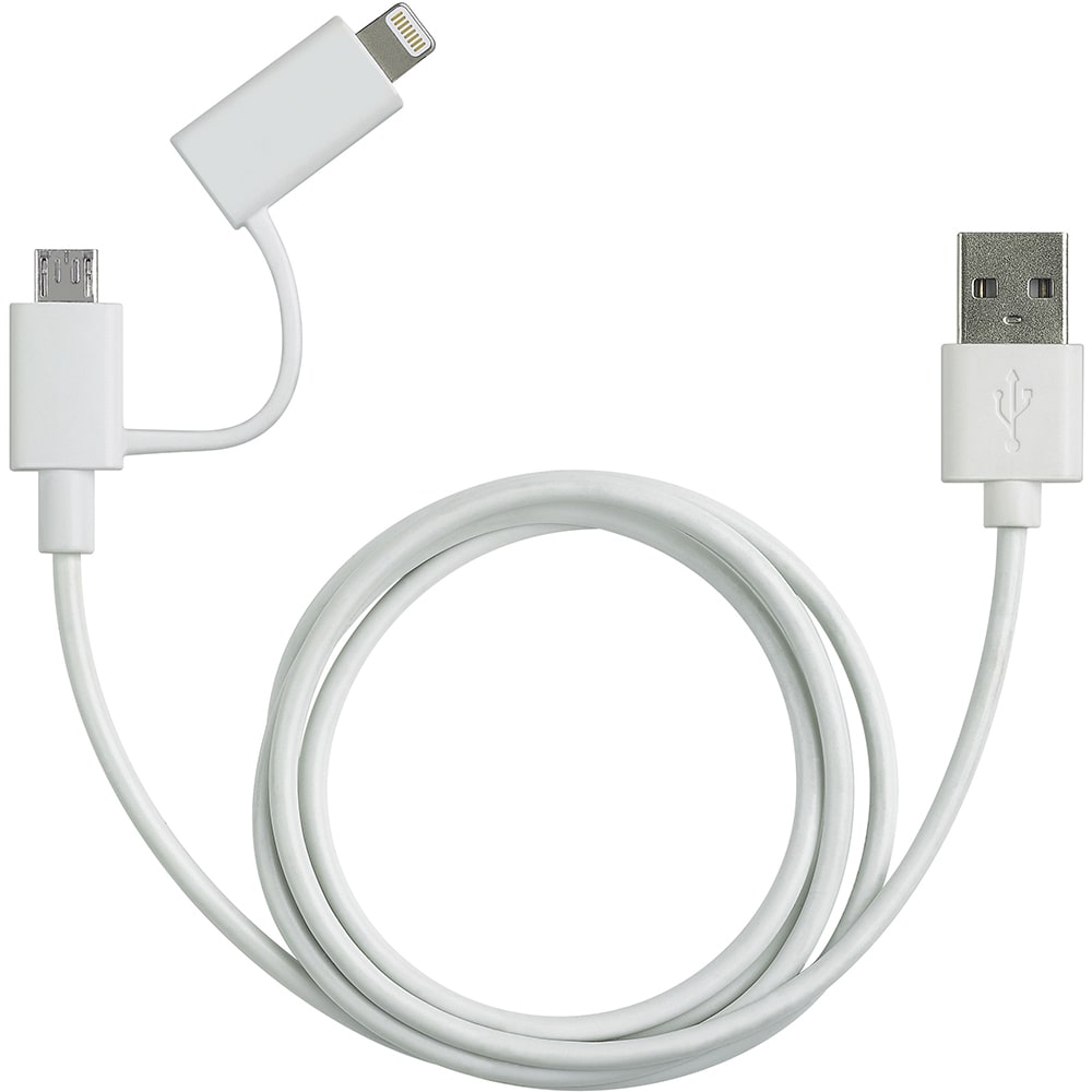 Connettore 2 in 1. Adattatore con spina USB e 2 connettori standard: micro USB e made for iPod, iPhone e iPad, lunghezza cavo 1 metro per la ricarica di apparecchi tipo smartphone, tablet e similari. Formato blister: blister 72x122