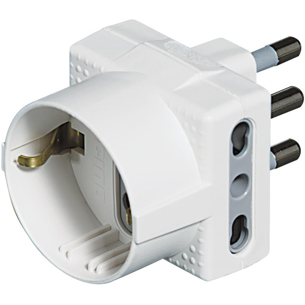 Esp (quantità minima 120) Adattatore TRIS con 1 presa tedesca 2 prese bipasso 10/16A di colore bianco