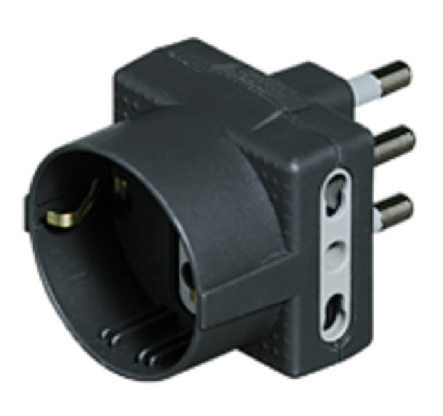 Adattatore TRIS con 1 presa tedesca 2 prese bipasso 10/16A di colore antracite. Venduto in blister 90x122 mm (LxA)
