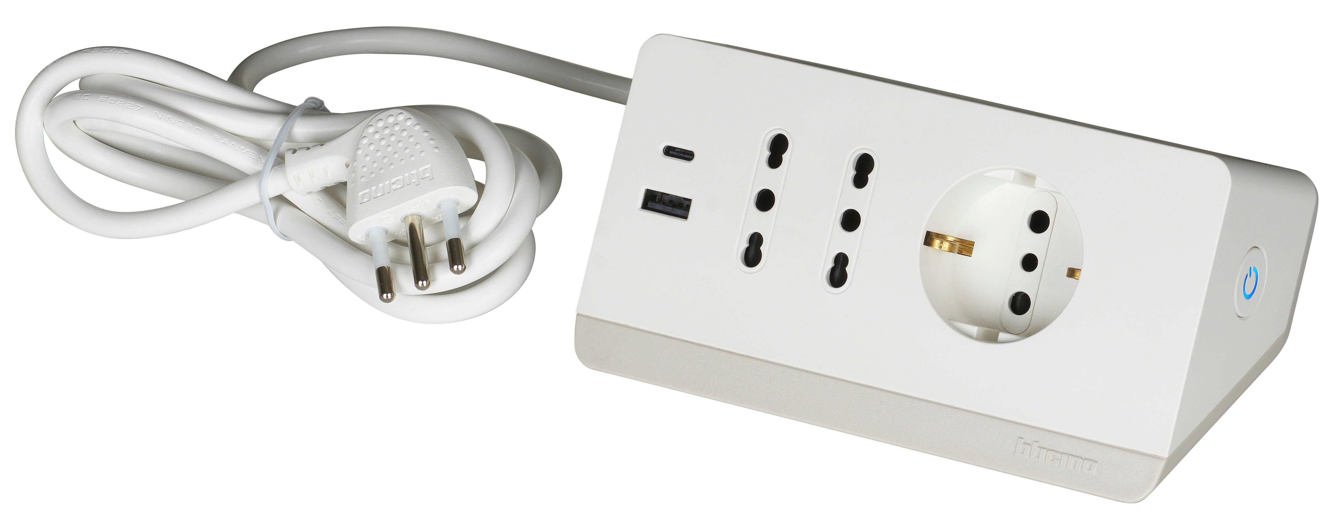 Multipresa da scrivania con 2 prese 2P+T bipasso (10/16 A), una presa tedesca P30 e due prese USB tipo A+C, interruttore di sicurezza, cavo 2 m e spina salvaspazio da 10 A - bianca
