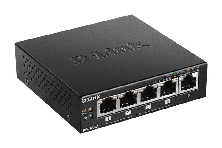 Switch desktop 5 porte Gigabit PoE+ DGS-1005P • 5 porte Gigabit Ethernet (4 porte PoE+) • PoE+, rendimento energetico massimo di 60 W • Capacità switch fabric 10 Gbps • Semplicità Plug&Play per una facile installazione • Garanzia D-Link di 2 anni