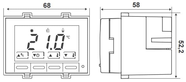 Termostato elettronico da incasso a microprocessore, per il comando di impianti di riscaldamento e di condizionamento. Il kit comprende: 3 cover colorate bianco, silver, antracite; 3 cover speciali per Bticino Axolute, Ave Sistema 44, Eikon Evo e Arkè bianco, silver, antracite; 3 coppie di adattatori colorati bianco, silver, antracite; 1 coppia di adattatori per BTicino Matix bianco; 3 telai per offrire compatibilità con le più diffuse placche. Il termostato dispone di 4 tasti frontali per accedere direttamente ai modi di funzionamento modificabili tramite la pressione del tasto corrispondente. 3 modi di funzionamento: COMFORT; ECONOMY; OFF utilizzabile come modo di funzionamento “antigelo” oppure per spegnere totalmente l’impianto (OFF). 3 temperature impostabili: COMFORT: gestisce l’impianto sulla temperatura di comfort impostabile da 2°C a 40°C; ECONOMY: gestisce l’impianto sulla temperatura di risparmio impostabile da 2°C a 40°C; OFF: temperatura impostabile in modo “regolazione” da 0 a 7°C per garantire la funzione antigelo. Gestione ESTATE-INVERNO. Il termostato ha la possibilità di collegare una sonda limite per la temperatura di minima T/min e temperatura di massima T/max.