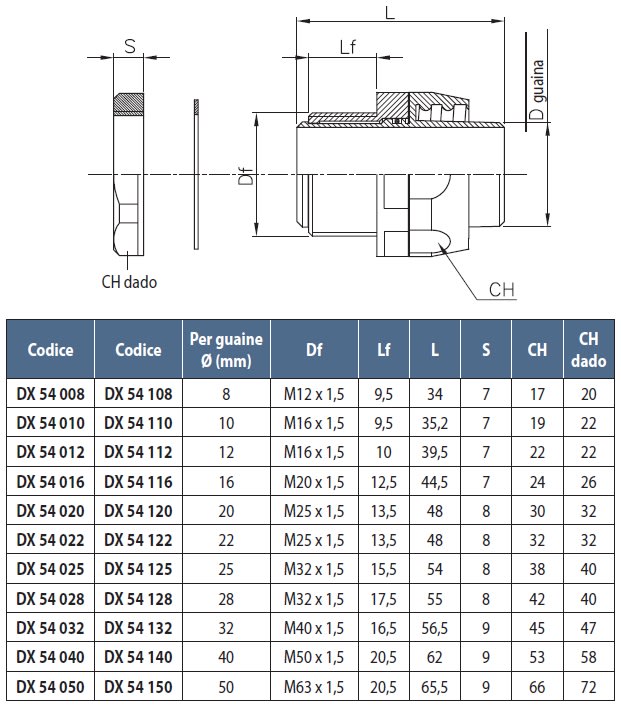 Raccordo girevole dritto con passo metrico, per raccordare guaine spiralate con scatole di derivazione in fori filettati con passi metrici o fori non filettati, mediante il dado e la guarnizione in dotazione.