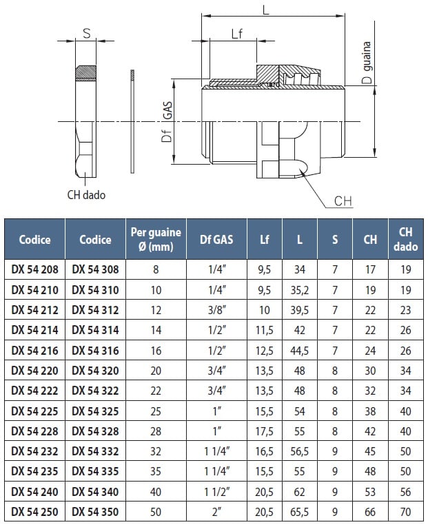 Raccordo girevole dritto con passo gas, per raccordare guaine spiralate con scatole di derivazione in fori filettati con passi GAS o fori non filettati, mediante il dado e la guarnizione in dotazione.