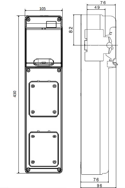 Quadro stagno Q-DIN 5 moduli vuoto in plastica grigio RAL 7035 IP65. • Numero di calotte: 2 IEC 309 16/32A IP44/67 • Numero di coperchi ciechi in dotazione: 1 IEC 16/32A