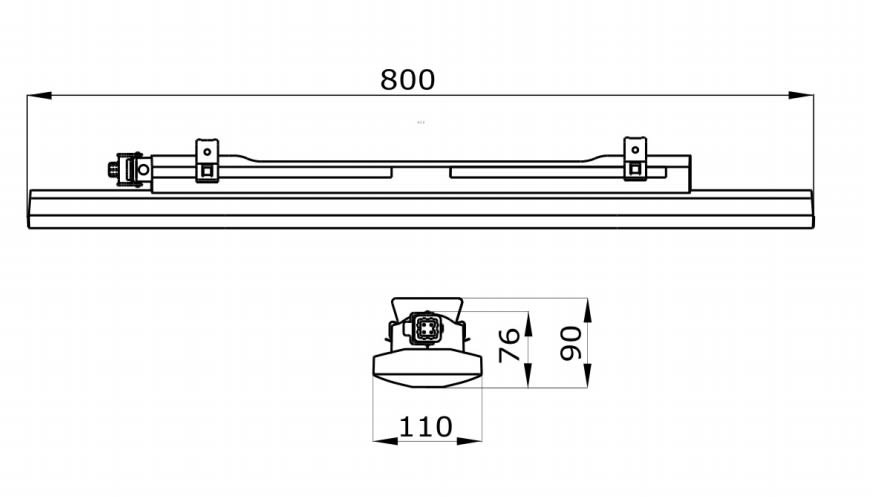 Plafoniera con MID Power LED (double or single die) dotata di dissipatore / riflettore in acciaio preverniciato bianco. Corpo in PC grigio RAL7035. Schermo / diffusore in PC stabilizzato agli U.V.. Sigillante depositato a CNC. Sistema di fissaggio a parete, plafone o sospensione tramite molle in acciaio armonico con zona di attacco regolabile. Connettore rapido integrato nell'apparecchio per cavi diametro max 12.5mm. Driver LED elettronico rifasato. Schermo Trasparente. Lampada: LED 26W 4140Lm 4000K. Lunghezza: 800 mm.