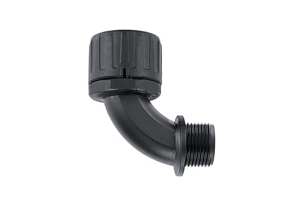 Formato da un unico elemento, ad inserimento rapido. Elevata resistenza agli strappi. Elevata resistenza a solventi ed olii. Zero alogeni, solfati e fosfati. Filetto maschio con controdado. Raccordo curvato a 90° con filetto maschio.