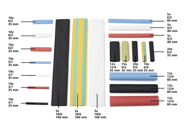 Kit compatto e pratico. Guaina termorestringente nera e colorata. Range di applicazione da 3 mm fino a 18 mm. 177 spezzoni in cinque diversi diametri. Con ShrinKit 321 HellermannTyton ha imposto un nuovo standard per le guaine termorestringenti: la gammadi guaine termorestringenti ShrinKit con il loro fattore di restringimento 3:1 copre molteplici applicazioni.