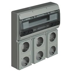 Quadro con flange componibili IP44, IK09. Materiale: corpo in ABS - finestre in policarbonato. Fissaggio a muro senza dover aprire il centralino. Completi di flange per l’installazione di prese da pannello. Versione con flangia per 6 prese da pannello, guida DIN 18+2 moduli e portello trasparente