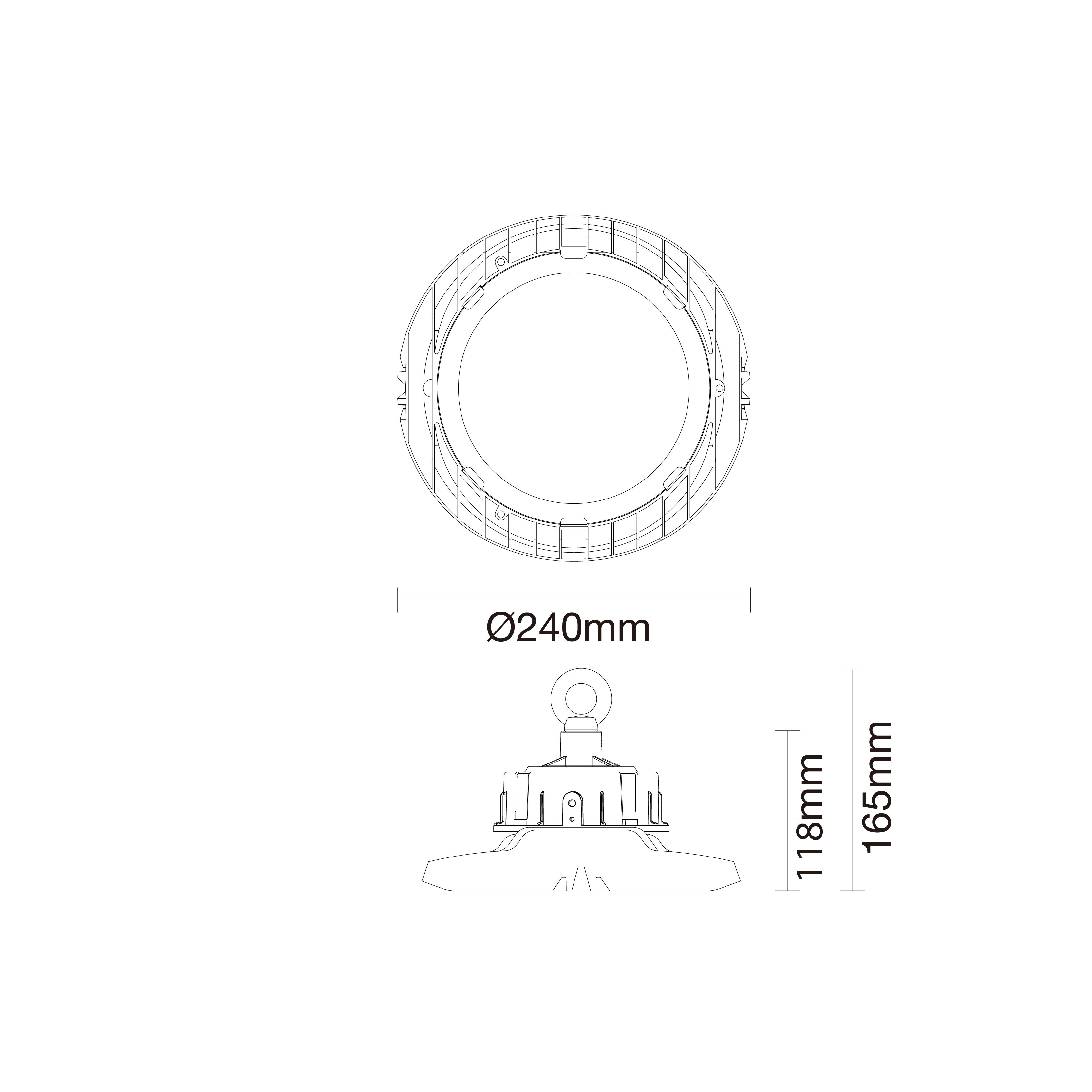 Riflettore LED High Bay, 100-240V 50/60Hz, 100W, 16000lm, 160lm/W, flicker free 4000K, IP65, non-dimmerabile, driver LED non isolato, SMD2835, CRI 80, SDCM 6, Ø240 X 165mm. Custodia pressofusa con copertura in vetro, 0,5m cavo senza connettore