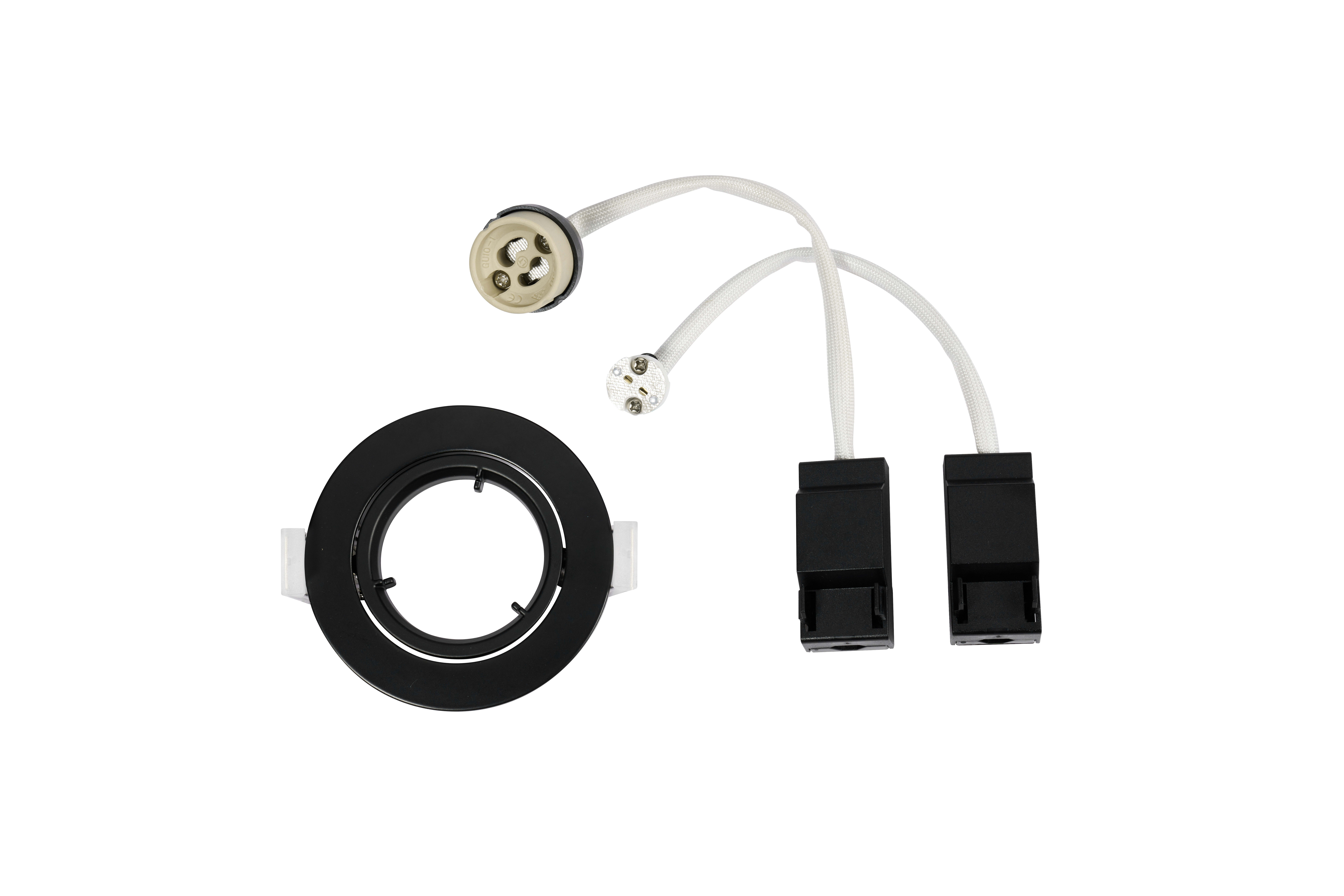 Faretto orientabile, φ85*28 mm, foro φ75 mm, montaggio a incasso a soffitto, IP20, IK02, corpo e cornice in alluminio, nero, angolo di inclinazione 12°, 3 anni di garanzia. Accessori: portalampada GU10*1 (2x0,75 mm²-1,5 mm²) + portalampada GU5.3*1 (entrambi con cavo in tessuto bianco da 150 mm e scatola di giunzione con 2 terminali da 0,75 mm²-1,5 mm²)