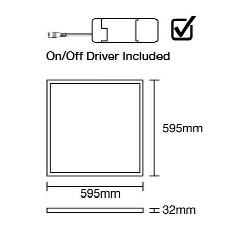 Pannello retroilluminato 600x600, On/Off, 32W, 4000K,3520lm, 110lm/W, UGR<19, 220-240V, IP20, IK02, BA90, SDCM5(ANSI), SDCM3,-20?/+40?C, 50.000H (50.000h L80B10 per LED, 50.000H per driver), driver esterno TOSPO. LED Lumileds SMD 2835, Classe II, bianco (RAL9016, lucido), diffusore microprismatico e corpo in alluminio+piastra posteriore SPCC, cavo 15cm con connettore femmina bianco, connettore maschio 15cm dal driver. 2 ganci di sicurezza. 5 anni di garanzia