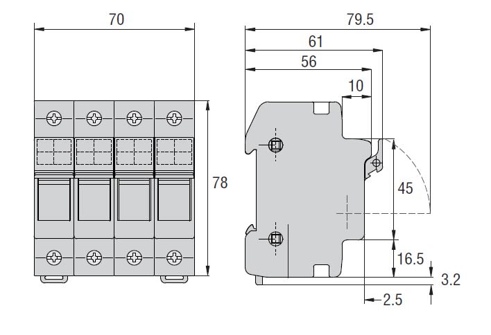BASE PORTAFUSIBILI, PER FUSIBILI 10X38MM. CORRENTE NOMINALE 32A (690VAC), 3P+N. SENZA INDICATORE LUMINOSO. 4 MODULI