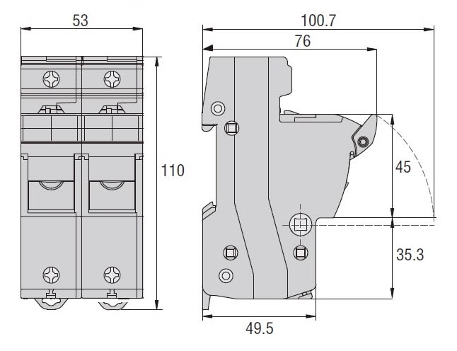 BASE PORTAFUSIBILI OMOLOGATA CURUS, PER FUSIBILI 14X51MM. CORRENTE NOMINALE 50A (690VAC), 2P. SENZA INDICATORE LUMINOSO. 2 MODULI