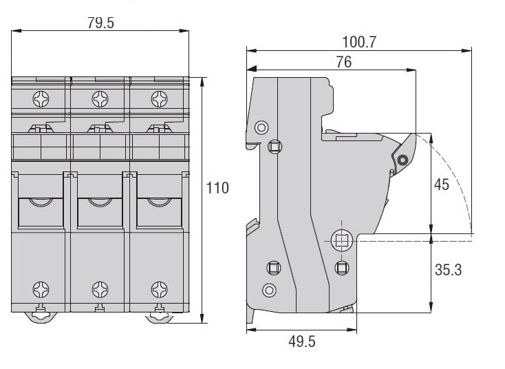 BASE PORTAFUSIBILI OMOLOGATA CURUS, PER FUSIBILI 14X51MM. CORRENTE NOMINALE 50A (690VAC), 3P. SENZA INDICATORE LUMINOSO. 3 MODULI