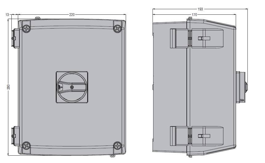 CONTENITORE VUOTO TIPO IEC/EN IP65, PER INTERRUTTORI SEZIONATORI. CON MANIGLIA NERA, PER GA125A...GA160A
