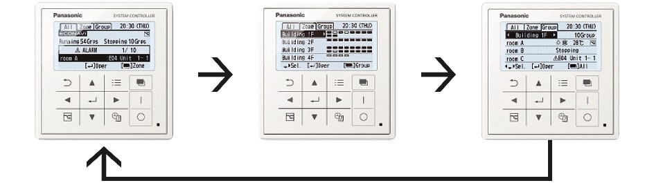 Comando centralizzato con timer Tutte le funzioni in un unico dispositivo Il dispositivo di controllo CZ-64ESMC3 è dotato di timer programmabile Panasonic. La flessibilità del timer consente di programmare quando riscaldare o raffrescare gli ambientisotto il controllo del dispositivo. Gli utenti possono programmare il sistema in vista delle vacanze, sospendere l'operatività per lunghi periodi di tempo, così da evitare di riscaldare o raffrescare una casa o degli uffici vuoti, con conseguente importante risparmio energetico. Il modulo di controllo di sistema consente di programmare fino a 6 eventi al giorno.