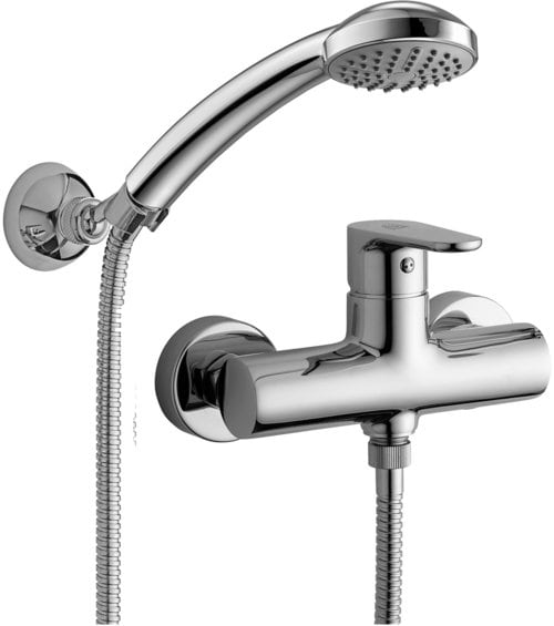 Miscelatore doccia senza set doccia, con supporto a muro snodato con leva in ABS e con doccia e flessibile, completo di: • set 2 eccentrici 1/2”x3/4”G e rosoni. Finitura cromo