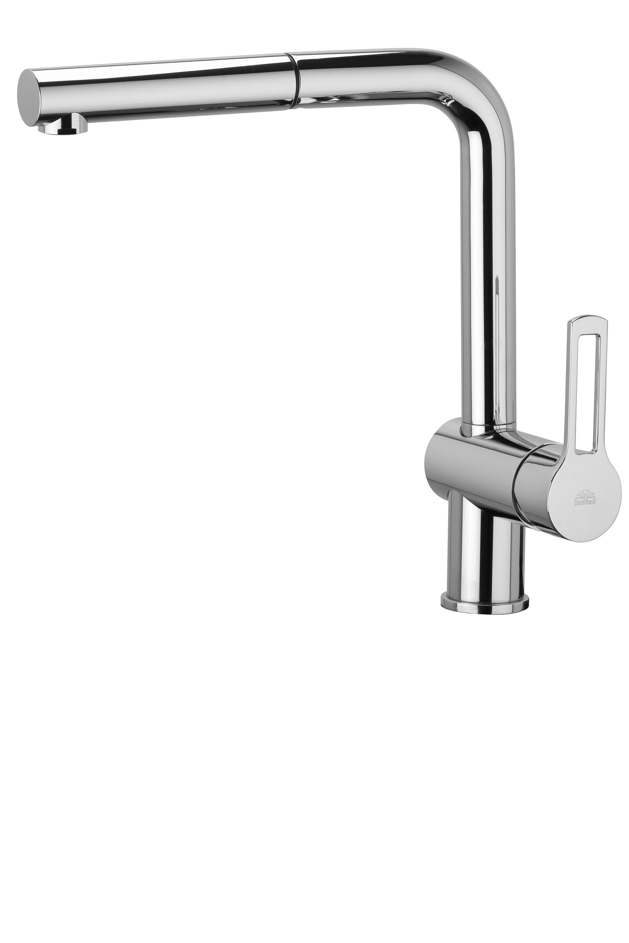 Miscelatore lavello monoforo con canna orientabile e con doccia estraibile (monogetto) in ABS, completo di: • set 2 flessibili inox 3/8”G • 1 flessibile inox M15x1 • 1 flessibile nylon 1/2”G x M15x1 cm. 150 con piombo. Finitura cromo