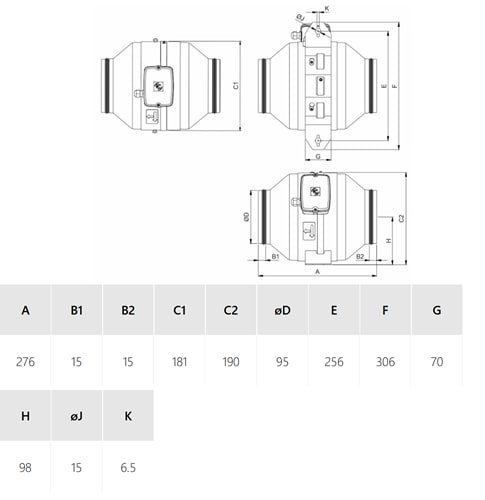 Ventilador en línea para conductos circulares con carcasa de muy bajo perfil fabricada con chapa de acero galvanizado y junta de goma en las bridas. Rodete de alto rendimiento,directrices y difusor de descarga fabricados con plástico inyectado, para aumentar el rendimiento y disminuir el nivel sonoro. Caja de bornes IP65 fijada en la carcasa. Pie soporte suministrado con el ventilador, que permite montar el ventilador en dos posiciones diferentes y con cualquier orientación del eje. Motor Motor monofásico de rotor externo montado con soporte antivibratorio para limitar la transmision de las vibraciones y reducir el nivel de ruido, 220-240V 50/60Hz, IP44, clase F, con protección térmica de rearme manual y velocidad regulable por tensión.Temperatura de trabajo -20/60ºCModelo JETLINE-100 (220-240V50/60HZ) RE *.