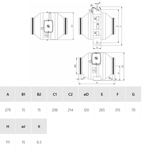 Ventilador en línea para conductos circulares con carcasa de muy bajo perfil fabricada con chapa de acero galvanizado y junta de goma en las bridas. Rodete de alto rendimiento,directrices y difusor de descarga fabricados con plástico inyectado, para aumentar el rendimiento y disminuir el nivel sonoro. Caja de bornes IP65 fijada en la carcasa. Pie soporte suministrado con el ventilador, que permite montar el ventilador en dos posiciones diferentes y con cualquier orientación del eje. Motor Motor monofásico de rotor externo montado con soporte antivibratorio para limitar la transmision de las vibraciones y reducir el nivel de ruido, 220-240V 50/60Hz, IP44, clase F, con protección térmica de rearme manual y velocidad regulable por tensión.Temperatura de trabajo -20/60ºCModelo JETLINE-125 (220-240V50/60HZ) N8 *.