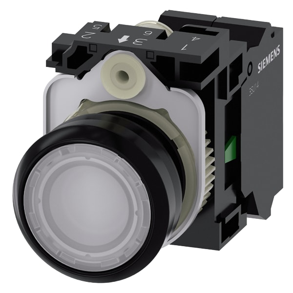 pulsante luminoso, 22 mm, rotondo, in plastica, bianco, bottone, piatto, ad impulso, con supporto, 1 NO, modulo LED con LED integrato AC 110 V, morsetto a molla Pulsanti luminosi SIRIUS ACT per la commutazione e il comando di utilizzatori elettrici. Siemens offre, sotto il nome commerciale SIRIUS ACT, un portfolio esclusivo di dispositivi di comando e segnalazione con omologazioni di prodotto per il mercato mondiale in tre moderne serie di design in robusto metallo puro e plastica pregiata.Linnovativo concetto di innesto a scatto semplifica talmente il montaggio che per eseguirlo basta una sola mano e non servono attrezzi speciali. Per i fori di montaggio sono sufficienti semplici fori non scanalati, essendo già integrata una protezione antirotazione al 100 %.Grazie al grado di protezione elevato i robusti apparecchi sono adatti allimpiego industriale e in ambiente esterno. È persino possibile la pulizia con getto ad alta pressione. Né polvere, né oli, né liscivia possono comprometterne il funzionamento affidabile.Oltre che con il cablaggio standard, gli apparecchi possono essere collegati al controllore anche tramite PROFINET, AS-Interface oppure IO-Link. Potete così ridurre il vostro onere di cablaggio, minimizzare le fonti di errore e ottenere maggiore flessibilità.Il configuratore online grafico supporta in modo confortevole la scelta e lordinazione di singoli apparecchi, pulsantiere e iscrizioni. È disponibile una documentazione completa (ad es. manuale, dati 3D, schema di collegamento). Esecuzioni fornibili: più colori, luminoso/non luminoso, con/senza iscrizione, comando permanente/ad impulso, diverse altezze di bottone e ghiera. Avvertenza: Apparecchio completo, fornitura incl. supporto e moduli. SIRIUS ACT - Performance in Action nel comando e nella segnalazione. Semplici da montare, altamente performanti, semplicemente perfetti.
