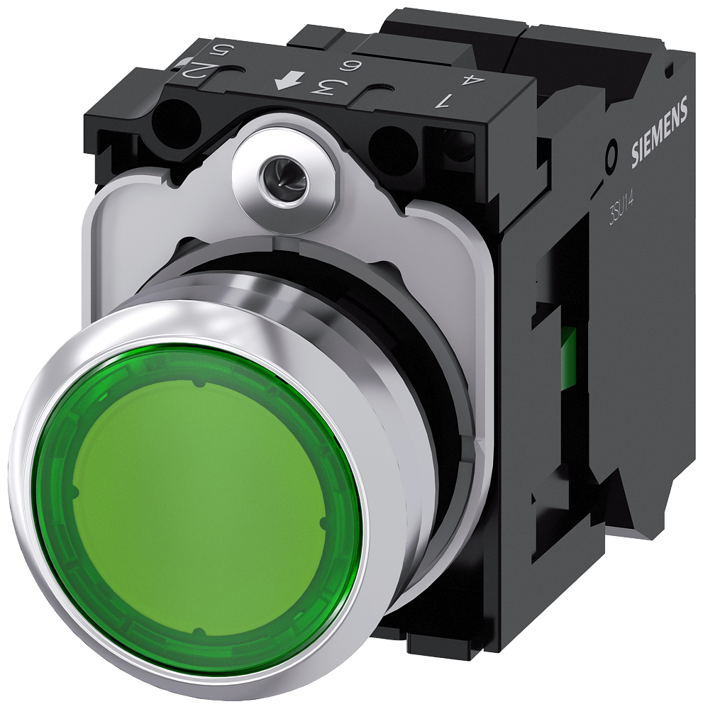 pulsante luminoso, 22 mm, rotondo, in metallo, lucido, verde, bottone, piatto, ad impulso, con supporto, 1 NO, modulo LED con LED integrato AC 230 V, morsetto a molla Pulsanti luminosi SIRIUS ACT per la commutazione e il comando di utilizzatori elettrici. Siemens offre, sotto il nome commerciale SIRIUS ACT, un portfolio esclusivo di dispositivi di comando e segnalazione con omologazioni di prodotto per il mercato mondiale in tre moderne serie di design in robusto metallo puro e plastica pregiata.Linnovativo concetto di innesto a scatto semplifica talmente il montaggio che per eseguirlo basta una sola mano e non servono attrezzi speciali. Per i fori di montaggio sono sufficienti semplici fori non scanalati, essendo già integrata una protezione antirotazione al 100 %.Grazie al grado di protezione elevato i robusti apparecchi sono adatti allimpiego industriale e in ambiente esterno. È persino possibile la pulizia con getto ad alta pressione. Né polvere, né oli, né liscivia possono comprometterne il funzionamento affidabile.Oltre che con il cablaggio standard, gli apparecchi possono essere collegati al controllore anche tramite PROFINET, AS-Interface oppure IO-Link. Potete così ridurre il vostro onere di cablaggio, minimizzare le fonti di errore e ottenere maggiore flessibilità.Il configuratore online grafico supporta in modo confortevole la scelta e lordinazione di singoli apparecchi, pulsantiere e iscrizioni. È disponibile una documentazione completa (ad es. manuale, dati 3D, schema di collegamento). Esecuzioni fornibili: più colori, luminoso/non luminoso, con/senza iscrizione, comando permanente/ad impulso, diverse altezze di bottone e ghiera. Avvertenza: Apparecchio completo, fornitura incl. supporto e moduli. SIRIUS ACT - Performance in Action nel comando e nella segnalazione. Semplici da montare, altamente performanti, semplicemente perfetti.