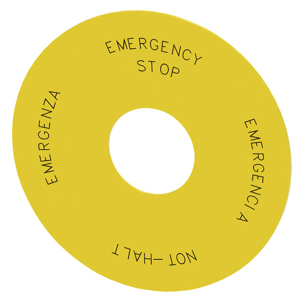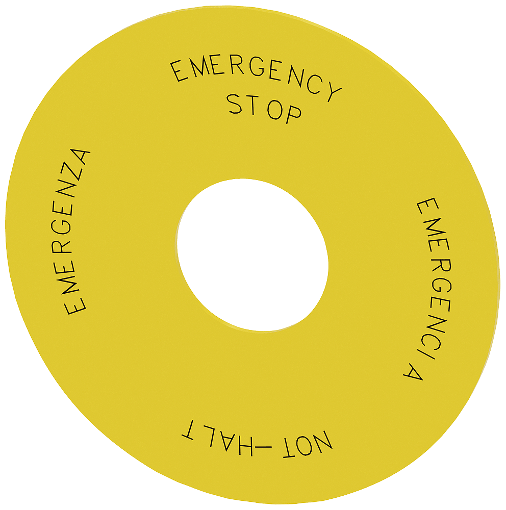 targhetta con dicitura rotonda, per pulsante a fungo di ARRESTO DI EMERGENZA, giallo, autoadesivo, diametro esterno 75 mm, diametro interno 23 mm, con iscrizione: NOT-HALT, EMERGENCY STOP, EMERGENZA EMERGENCIA in 4 lingue: de,en,it,es Targhetta rotonda per ARRESTO DI EMERGENZA per la siglatura dei dispositivi di comando e segnalazione SIRIUS ACT. Siemens offre, sotto il nome commerciale SIRIUS ACT, un portfolio esclusivo di dispositivi di comando e segnalazione con omologazioni di prodotto per il mercatomondiale in tre moderne serie di design in robusto metallo puro e plastica pregiata.Linnovativo concetto di innesto a scatto semplifica talmente il montaggio che per eseguirlo basta una sola mano e non servono attrezzi speciali. Per i fori di montaggio sono sufficienti semplici fori non scanalati, essendo già integrata una protezione antirotazione al 100 %.Grazie al grado di protezione elevato i robusti apparecchi sono adatti allimpiego industriale e in ambiente esterno. È persino possibile la pulizia con getto ad alta pressione. Né polvere, né oli, né liscivia possono comprometterne il funzionamento affidabile.Oltre che con il cablaggio standard, gli apparecchi possono essere collegati al controllore anche tramite PROFINET, AS-Interface oppure IO-Link. Potete così ridurre il vostro onere di cablaggio, minimizzare le fonti di errore e ottenere maggiore flessibilità.Il configuratore online grafico supporta in modo confortevole la scelta e lordinazione di singoli apparecchi, pulsantiere e iscrizioni. È disponibile una documentazione completa (ad es. manuale, dati 3D, schema di collegamento). Ampia gamma di accessori opzionali (ad es. targhette identificative, per protezione e accesso, operatori, accessori per pulsantiere). SIRIUS ACT - Performance in Action nel comando e nella segnalazione. Semplici da montare, altamente performanti, semplicemente perfetti.