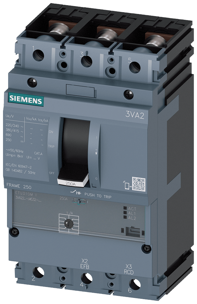 interruttore automatico 3VA2 IEC frame 250 classe del potere di interruzione E Icu=200 kA con 415 V a 3 poli, protezione avviatore motore ETU310M, I, In=160A protezione da cortocircuito Ii=3...15 x In attacchi piatti a vite Interruttore automatico scatolato SENTRON 3VA2 per una protezione avviatore efficace per la protezione da cortocircuito di motori elettrici. Gli interruttori automatici scatolati 3VA fissano standard di riferimento per quanto riguarda flessibilità e varietà di elementi modulari con ingombro ridotto. Gli interruttori automatici scatolati 3VA2 sono disponibili in esecuzione a 3 e 4 poli con diverse correnti permanenti nominali per il montaggio in esecuzione fissa nonché in esecuzione rimovibile/estraibile. Gli accessori modulari e facili da installare, con unampia gamma di funzioni, sono omogenei per tutte le grandezze costruttive e tutte le serie costruttive di interruttori automatici scatolati 3VA. Interruttori automatici scatolati SENTRON 3VA - un sistema. Per tutte le applicazioni.