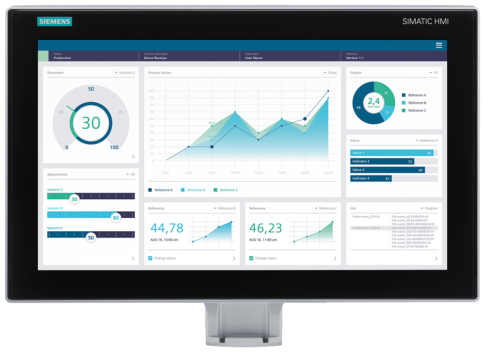 SIMATIC HMI MTP1900 PRO, per piede di appoggio (ampliabile, flangia in basso), display TFT widescreen da 18,5, 16 milioni di colori, interfaccia PROFINET, progettabile da WinCC Unified Comfort V18, comprende il software Open Source, che viene concesso gratuitamente I SIMATIC HMI Unified Comfort Panel PRO si contraddistinguono per lelevato grado di protezione IP65 (NEMA4) e la varietà delle opzioni di montaggio (ad es. direttamente sulla macchina oppure su un piedistallo o su un sistema di bracci di sostegno). Tutte le apparecchiature, nelle dimensioni da 12 a 22 pollici, offrono il massimo comfort operativo grazie alla moderna tecnologia Multi-Touch e consentono di realizzare soluzioni di comando innovative basate sul nuovo software di visualizzazione SIMATIC WinCC Unified. La funzionalità delle apparecchiature è facilmente ampliabile, secondo le proprie esigenze, grazie alla funzionalità Edge integrata. Ogni Unified Comfort Panel PRO è disponibile in due varianti di design. Design standard: con i marchiSiemens e SIMATIC HMI nonché telaio in alluminio colore argento. Design neutrale: senza marchi e con telaio in alluminio colore nero. I limiti del sistema sono identici a quelli degli Unified Comfort Panel (apparecchiature da incasso) e sono stati almenoraddoppiati, in parte persino triplicati, rispetto al modello precedente.