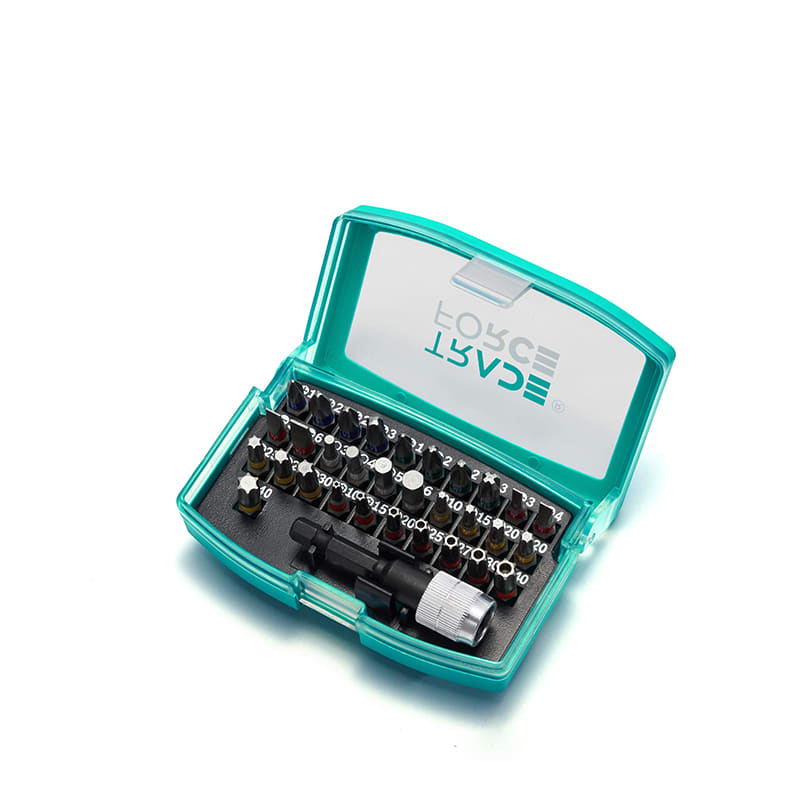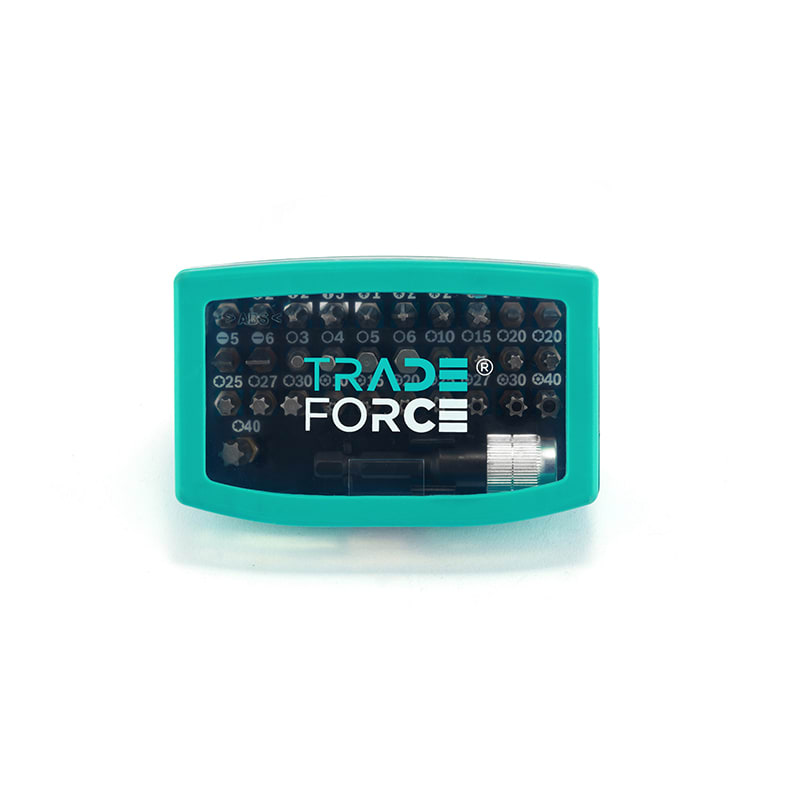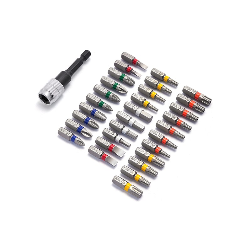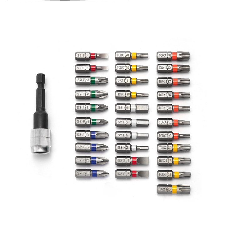 Set di inserti con anello colorato, 32 pezzi • 31 pezzi da 25 mm per inserti con anello colorato: PH1, 2x PH2, PH3; PZ1, 2x PZ2, PZ3; inserti esagonali: 3, 4, 5, 6; inserti a taglio: 3.0, 4.0, 5.0, 6.0; inserti Torx: T10, T15, 2x T20, T25, T27, T30, T40; inserti Torx di sicureza: Ts10, Ts15, Ts20, Ts25, Ts27, Ts30, Ts40 • 1 porta inserti 60mm con cambio rapido