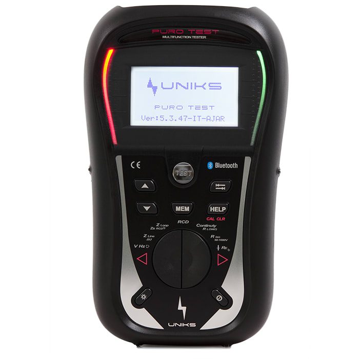 URO RAPPRESENTA L?ESSENZA DEGLI STRUMENTI MULTIFUNZIONE UNIKS PURO e uno strumento multifunzione che esegue tutte le misure per la sicurezza elettrica di impianti civili ed industriali in accordo alla CEI 64-8 Il design unico lo rende uno strumento compatto Semplice, Veloce e Preciso. E? dotato di due indicatori LED ai lati del display che consentono in modo estremamente intuitivo di comprendere il risultato delle prove. Si illuminano di verde o rosso PASS / NO PASS a seconda del risultato. PURO esegue misure sui differenziali (RCD) di tipo A, AC, F, B, B+, anche in modalita AUTO RCD, e permette di testare i differenziali EV delle colonnine di ricarica elettriche, misure di Impedenza di linea impostando il tipo di Fusibile o Magnetotermico.