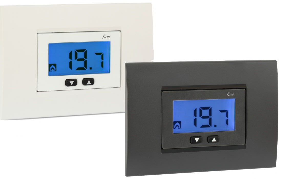 Termostato da incasso con display e alimentazione a batterie. La tastiera è composta da 2 tasti fisici che, unita al display con retroilluminazione di colore blu (attiva alla pressione di un tasto), garantisce al prodotto eleganza e sobrietà. La funzione“blocco tastiera” con password, utile ad esempio per installazioni in luoghi pubblici, impedisce modifiche delle impostazioni a persone non autorizzate. L’ingresso digitale consente il collegamento di un dispositivo esterno con il quale ridurre il setpoint di 3°C. Il prodotto viene fornito con i telaietti che consentono l’adattamento alle placche delle principali serie civili e i frontalini di colore bianco e grigio antracite; a parte è possibile acquistare il frontalino color argento.