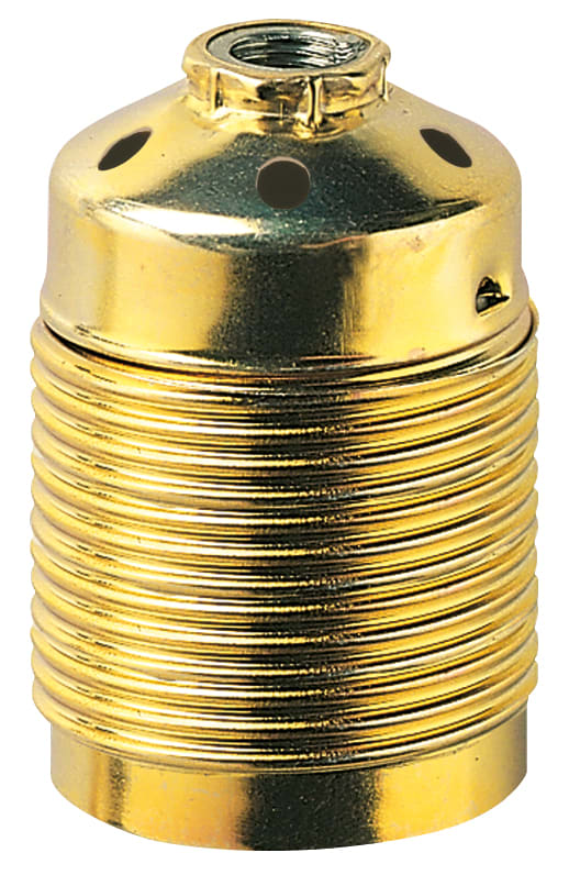 Portalampade E27, raccordo M10x1 con vite di blocco e morsetto di terra sul cappuccio, cappuccio e camicia filettata, acciaio zincato lucido colore ottone