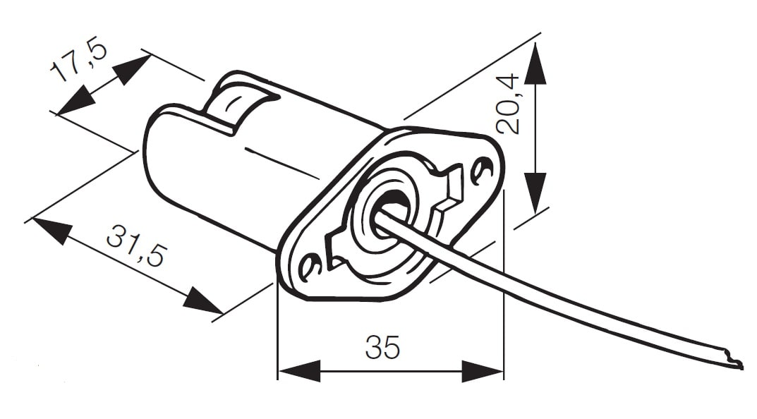 Portalampade metallico con base di fissaggio e pastiglia steatite 10 A 250 V attacco R7s per lampade alogene fino a 1500 W, 350 mm cavo teflon PTFE 1,5 mm2. Massima temperatura d’impiego continuo del portalampade 300 °C, del cavo 250 °C.Fori di fissaggio ø 3,3 mm interasse 28 mm