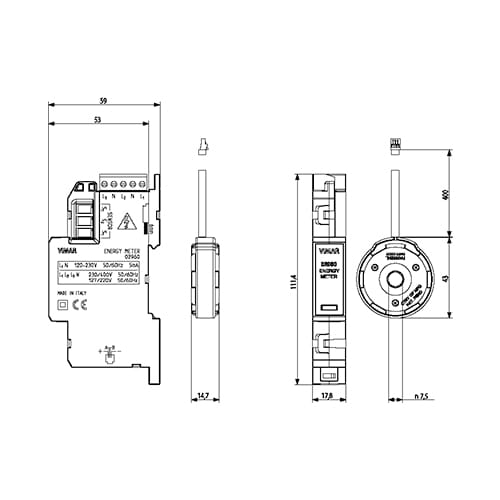 Misuratore di energia, 3 ingressi per sensore di corrente toroidale 01457, potenze rilevabili 50 W-10 kW, 1 uscita RJ9 seriale dati,installazione su guida DIN (60715 TH35), occupa 1 modulo da 17,5 mm. Fornito con un sensore di corrente toroidale 01457. Il dispositivo, da utilizzare interconnesso agli art. 02955 e 02910, permette di misurare il consumo/ produzione di energia elettrica istantanea e memorizzarne i dati nel tempo (tale funzione è attiva solo se il dispositivo è correttamente sincronizzato con un visualizzatore). Collegabile a linee monofase o trifase. In dotazione è fornita una sonda di corrente per la misura della potenza di una fase; la potenza sulle altre fasi è misurabile acquistando altre due sonde di corrente art. 01457.