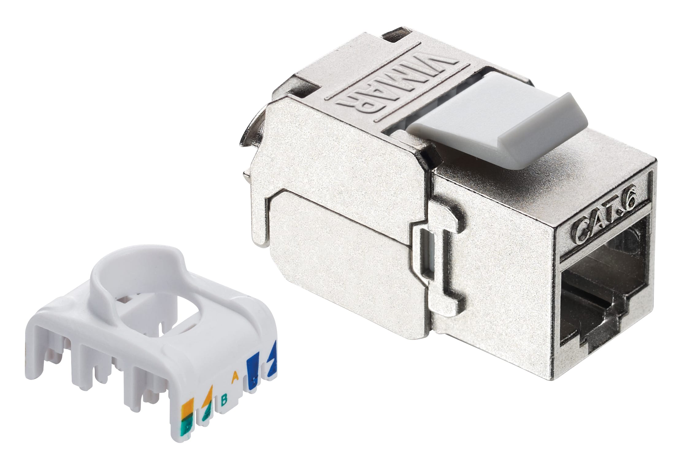 Connettore RJ45 Cat. 6, schermato, per pannello di permutazione 03024.E e 03303.E, cablaggio universale T568A/B, 8 contatti, morsetti ad incisione d'isolante senza utilizzo di utensile