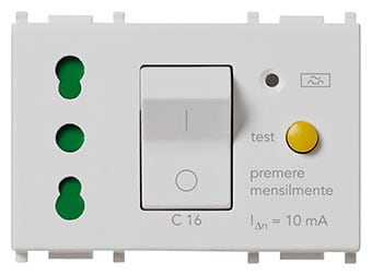 Bpresa SICURY 2P+T 16 A standard italiano tipo P17/11, interbloccata con interruttore automatico magnetotermico differenziale 1P+N C 16, 230 V~ 50 Hz, I¿n 10 mA, p.i. 3000 A, Silver - 3 moduli