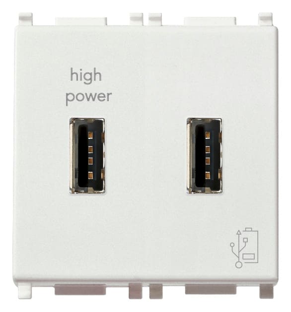 Unità di alimentazione 5 V 2,1 A per dispositivi elettronici, 2 uscite USB frontali, alimentazione 120-230 V~ 50/60 Hz - 2 moduli. Il dispositivo va utilizzato per ricaricare i telefoni cellulari e tutti gli apparecchi elettronici che offrono la possibilità di ricarica da una qualsiasi presa standard USB. Il dispositivo permette di ricaricare due apparecchi contemporaneamente.