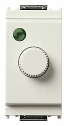 Regolatore 120 V~ 50-60 Hz per: lampade ad incandescenza 30-500 W, trasformatori ferromagnetici 30-300 VA, comando e regolazione con potenziometro rotativo, individuazione al buio, bianco.