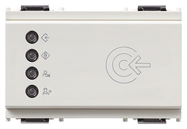 Lettore di carte a transponder per installazione all'esterno della stanza, standard KNX, 2 uscite a relè NO 4 A 24 V~, 2 ingressi, alimentazione 12-24 V~ 50-60 Hz e 12-24 V d.c. (SELV), bianco - 3 moduli. Fornito senza carta a transponder