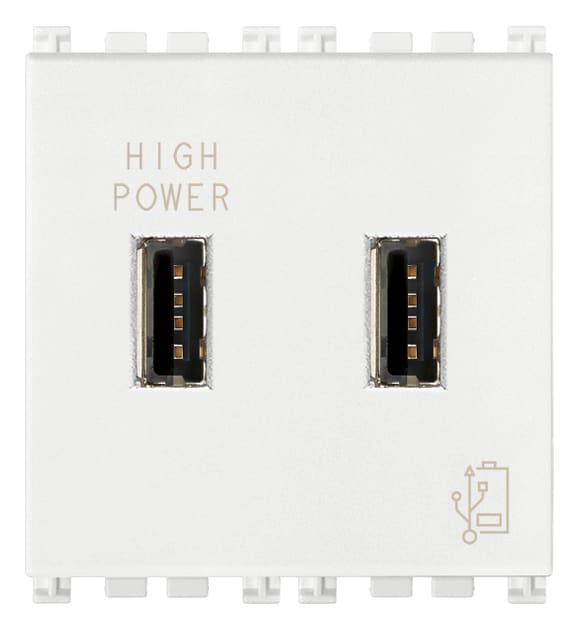Unità di alimentazione 5 V 2,1 A per dispositivi elettronici, 2 uscite USB frontali, alimentazione 120-230 V~ 50/60 Hz - 2 moduli. Il dispositivo va utilizzato per ricaricare i telefoni cellulari e tutti gli apparecchi elettronici che offrono la possibilità di ricarica da una qualsiasi presa standard USB. Il dispositivo permette di ricaricare due apparecchi contemporaneamente.
