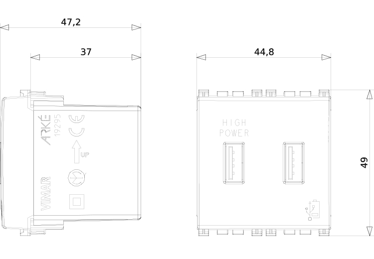 Unità di alimentazione 5 V 2,1 A per dispositivi elettronici, 2 uscite USB frontali, alimentazione 120-230 V~ 50/60 Hz - 2 moduli. Il dispositivo va utilizzato per ricaricare i telefoni cellulari e tutti gli apparecchi elettronici che offrono la possibilità di ricarica da una qualsiasi presa standard USB. Il dispositivo permette di ricaricare due apparecchi contemporaneamente.