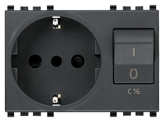 Presa SICURY 2P+T 16 A standard italiano tipo P30 (contatti di terra laterali e centrale), interbloccata con interruttore automatico magnetotermico 1P+N C 16, 230 V~ 50 Hz, p.i. 3000 A, grigio - 3 moduli